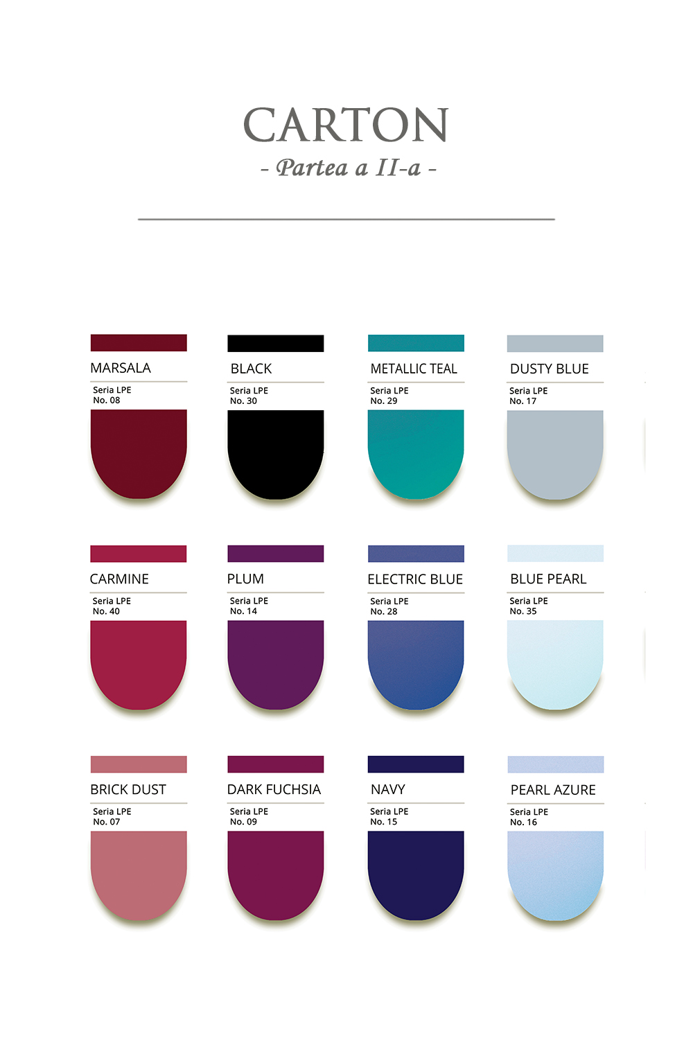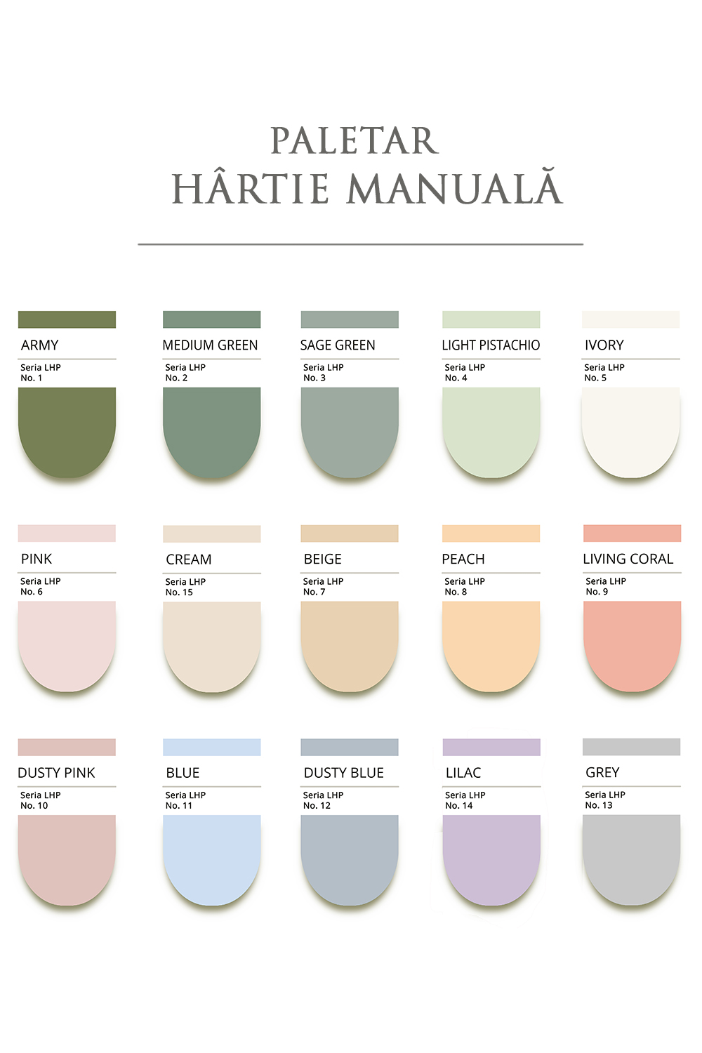 Acesta este paletarul de culori pentru articole realizate din HÂRTIE MANUALĂ ( pentru realizarea invitațiilor, plicurilor, name tag-urilor, meniurilor sau scrisorilor )