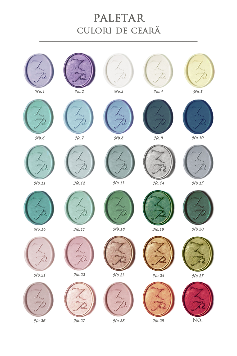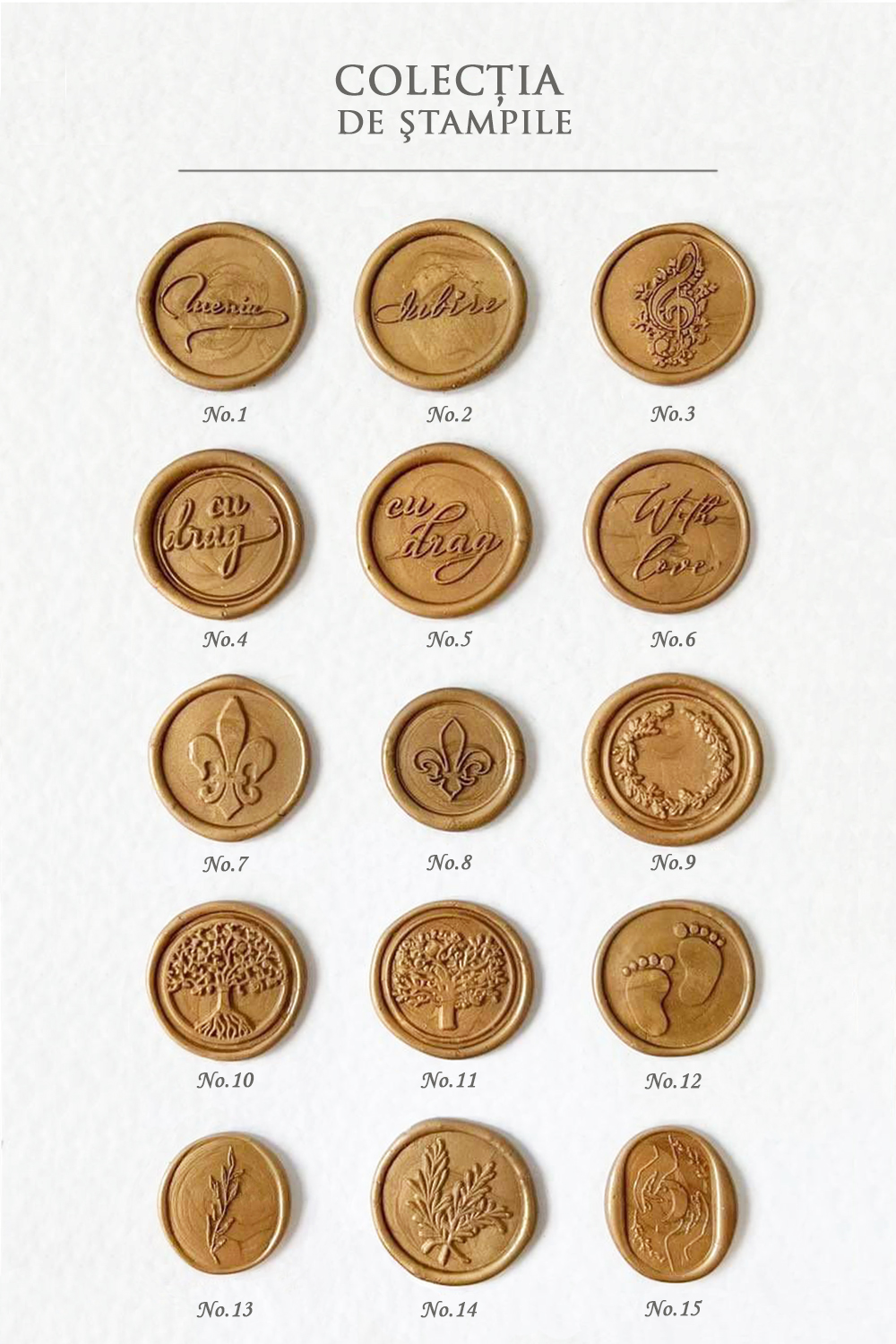 Puteți alege CULOAREA cearăi și DESIGNUL ștampilei din colecție sau puteți comanda un DESIGN PERSONALIZAT cu inițialele dumneavoastră.