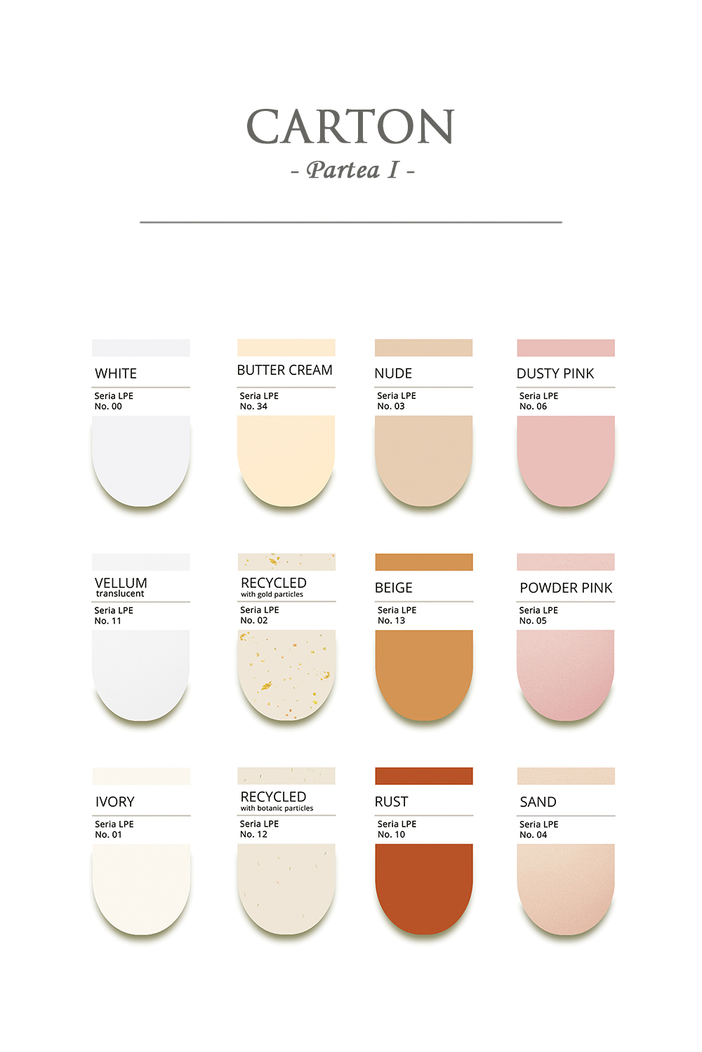 Acestea sunt culorile disponibile pentru produsele din CARTON & VELLUM ( hârtie transparentă ). Putem crea invitații, plicuri sau alte articole de papetărie utilizând cartoane de gramaje și texturi diferite, asigurându-ne că obținem cel mai bun rezultat.